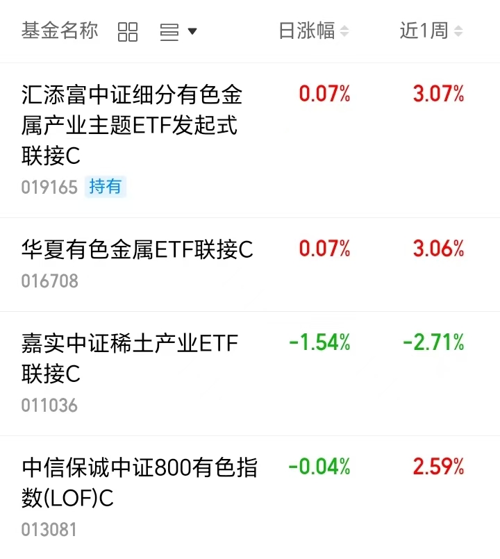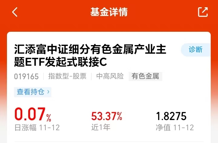 我之前买的$汇添富中证细分有色金属产业主题ETF发起式联接C(OTCFUND|019165)$今天超给力,盘中估值涨5.33%,又可以吃肉啦。业绩也能打,近一周涨3.07%逐渐超过同类,近三月32.88%、近半年58.76%!这只涵盖铜、稀土及锂等核心领域,包括紫金矿业、北方稀土、洛阳钼业、华友钴业及中国铝业等龙头。今天金属铜领涨,这只的含铜量30%比同类高很多。