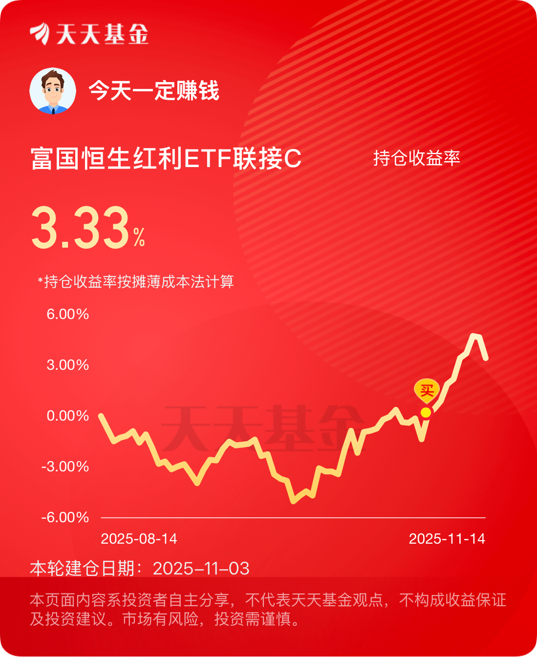 最近大盘波动很大,我11月初买的$富国恒生红利ETF联接C$ 目前已经浮盈3个多点,避险的同事还吃了一点收益,还是挺不错的。