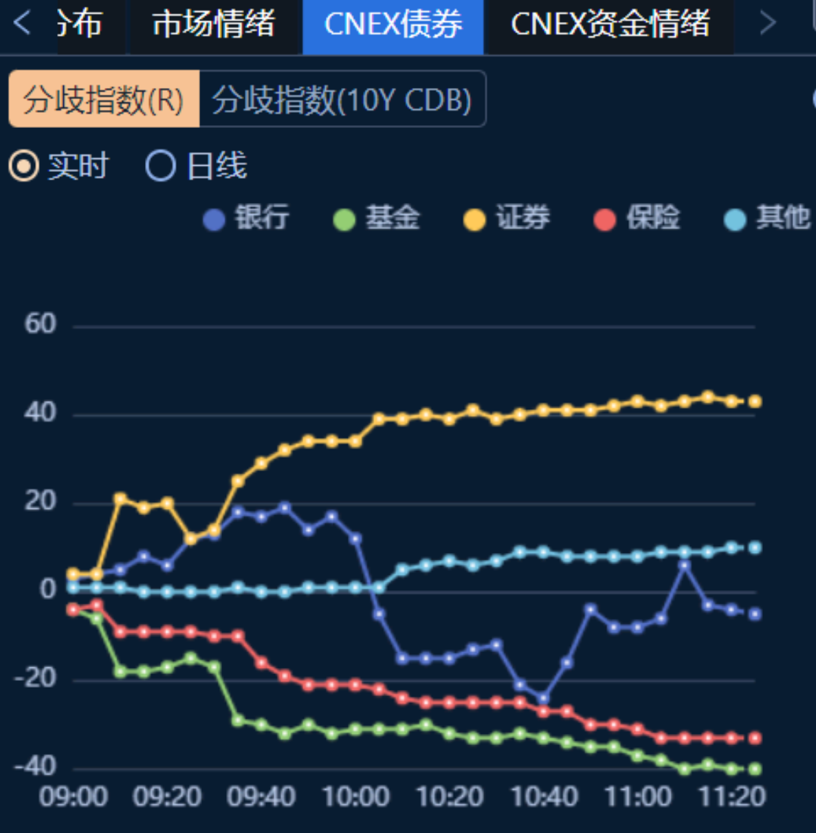 债券分歧指数显示,券商延续昨日买入趋势,早盘为主要买方;基金、保险卖出力度较大,银行近午间再度转为买入。