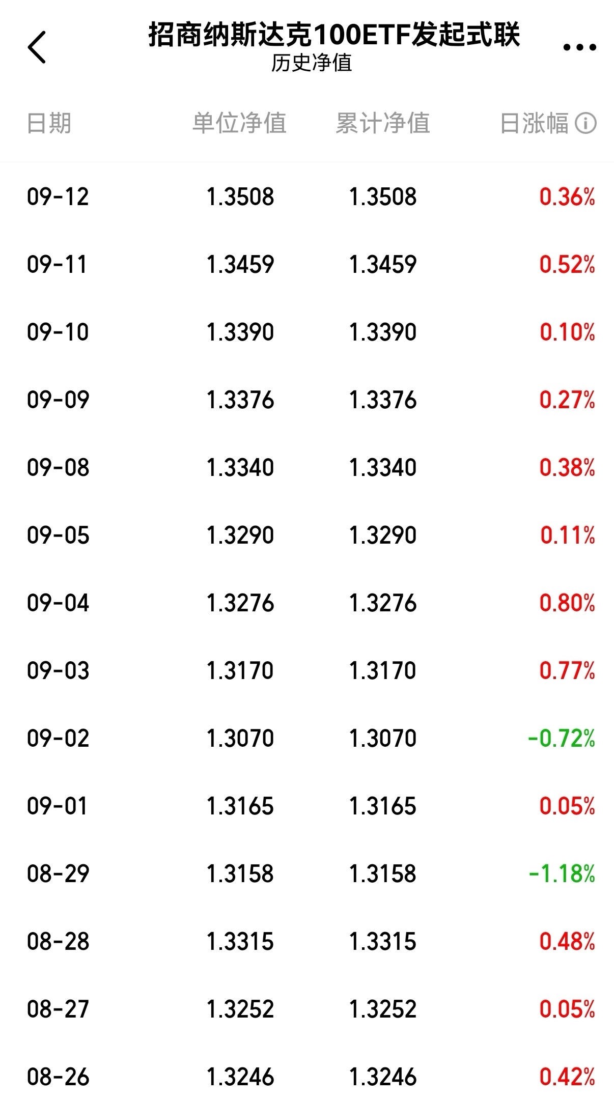 友友们,大家好,隔夜纳指低开高走,纳斯达克继续收红,真不错, 美股降息预期,历史一般降息后会上涨,因此后续对美股的持续看好,今天加1200元$招商纳斯达克100ETF发起式联接(QDII)C$ 这只基金业绩挺不错的, 近一年涨幅超19.29%,而且费率也有优势,买入0申购费,持有满7天免赎回费,投资非常灵活,相较于同类基金,这只基金的费率更低,趁额度还比较高加仓干了。