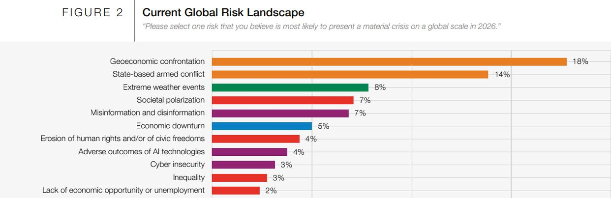 最近很多粉丝问我,现在全球市场这么动荡,到底该投什么?说实话,现在地缘政治风险真的不小,世界经济论坛刚发布的《2026年全球风险报告》直接把地缘经济对抗列为今年首要风险,国家间武装冲突、极端天气、社会极化这些风险都在持续加剧,经济风险更是上升最快的类别。再加上一些军事行动这种突发事件,市场避险情绪一下子就上来了,黄金价格直接冲上4600美元的历史新高。更深层次地看,这不仅仅是短期避险情绪驱动,而是全球宏观叙事在发生根本性的转变。过去十几年以“低增长、低通胀、低利率”为特征的旧范式正在瓦解,取而代之的是一个更高波动、更频繁受供给冲击、更考验实物资产配置能力的新时代。在这个时代,能源、矿产和土地等实物资源的战略属性,正超越其纯粹的商品属性,成为国家、企业乃至个人投资组合中不可或缺的“压舱石”。