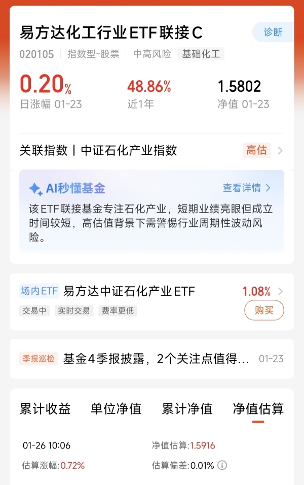 易方达化工产业指数这只聚焦化工产业的指数基金。紧密跟踪中证石化产品指数。覆盖化工的全产业链。周五上涨了0.2%,目前已经5天连涨。今天的估值继续继续稳定突破,马上又要创新高。紧跟指数的同时还跑赢了指数的涨幅。我看好长期的稳定收益表现。