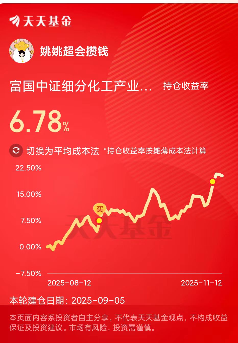 今天宝子们都在盯电池板块大涨?其实电池的上游化工板块早已悄悄崛起!姚姚前期安利的$富国中证细分化工产业主题ETF发起式联接C(OTCFUND|020274)$,近期堪称“化工王者”——今日大涨近4%,近一周逆势上涨7.07%,近三月更是上涨20.21%!日线、周线、月线清一色多头排列,强势向上趋势清晰!