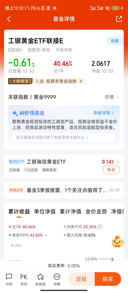 #10月你看好哪些投资赛道?# #低费工银黄金E#自从我加了一笔工银瑞信黄金ETF联接基金仓位以后,世界突然又再度和平了,哎~中东局势缓和,俄乌冲突更有结束的迹象,避险情绪降温引发大宗商品集体下挫,不过跟油气的跌幅比起来,黄金这点下跌只能算是毛毛雨,完全能接受。