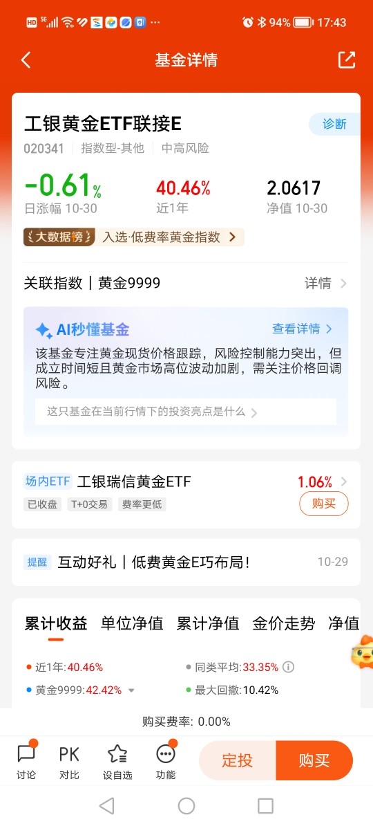 #低费工银黄金E#黄金作为多元配置资产的热度还将持续,今年以来黄金涨势不错,COMEX黄金历史突破4000美元/盎司的关口,需密切关注国际金价变动趋势,做好风险控制与资产配置,若要选择投资黄金资产,黄金ETF联接基金不失为一个好的选择。我看好$工银黄金ETF联接E$ ,我买黄金的理由,主要是外部风险还在,人们避险保值会购买黄金!而且央行又开始配置黄金,配置黄金性价比显著提升。工银黄金ETF联接基金E份额,全市场同类费率最低一档,0申购费,且E份额7天(含)以上免赎回费。我认为现在是提前配置黄金的好时机,未来仍长期看好黄金,作为长期投资的品种,近期回调时可以考虑提前布局配置!@工银瑞信基金