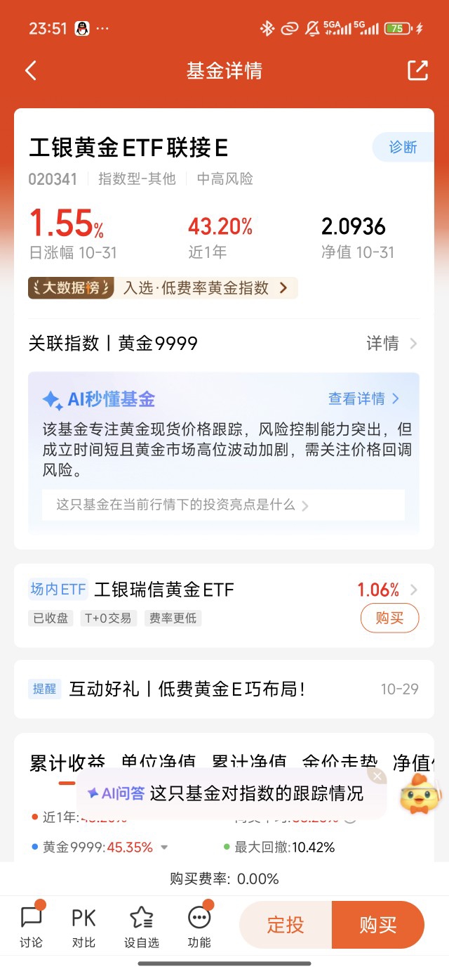 非常关注。费率直接影响长期投资收益,尤其黄金基金以跟踪金价为主,业绩差异较小,费率成为关键筛选因素。以$工银黄金ETF联接E$ 为例,0申购费、持有7天免赎回费,管理费+托管费(0.2%/年)为同类最低档,长期持有