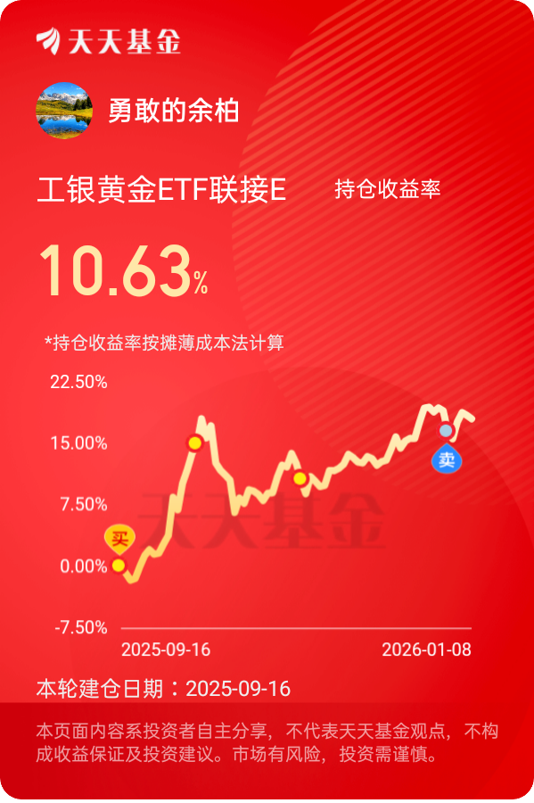2025 年黄金的出色表现为我们带来了丰厚的回报,2026 年黄金市场虽然面临一定的挑战,但依然充满机遇。我坚信,在工银瑞信专业团队的精心管理下,工银黄金 ETF 联接 E 将继续保持良好的表现,为投资者创造更加优异的成绩。我将继续坚定地长期持有该基金,与它一同迎接 2026 年的挑战与机遇,共同书写黄金投资的新篇章。@工银瑞信基金 #晒收益#