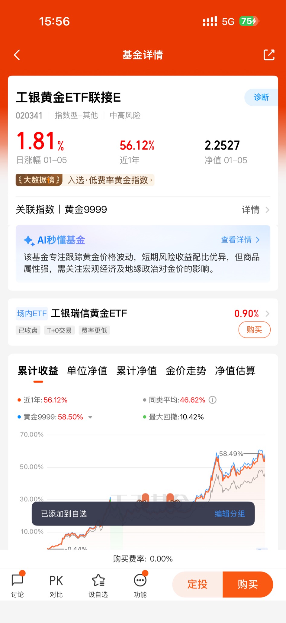 从业绩表现来看,该基金展现出强劲的收益能力:截至2026年1月9日,最新净值达2.2749,日涨跌幅0.69%;近1个月涨幅5.77%,近6个月涨幅30.34%,近12个月涨幅更是高达56.92%,成立以来累计收益逼近翻倍。这样的业绩表现,既受益于黄金市场的整体走强,也印证了其精准的跟踪能力。