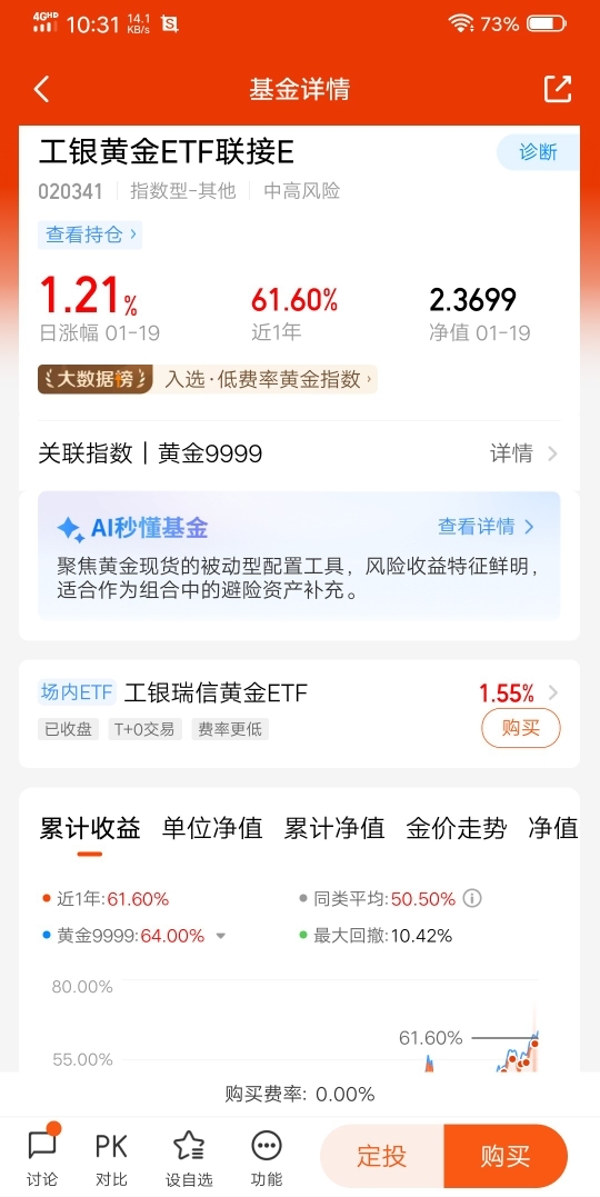 $工银黄金ETF联接E$ 最打动我的有低费率优势,持有7天以上还免收赎回费,大大降低了长期持有成本。作为普通投资者,很难精准把握黄金现货的短期波动,但通过这款基金紧密跟踪上海黄金交易所9999黄金现货价格走势,就能轻松分享黄金上涨红利。