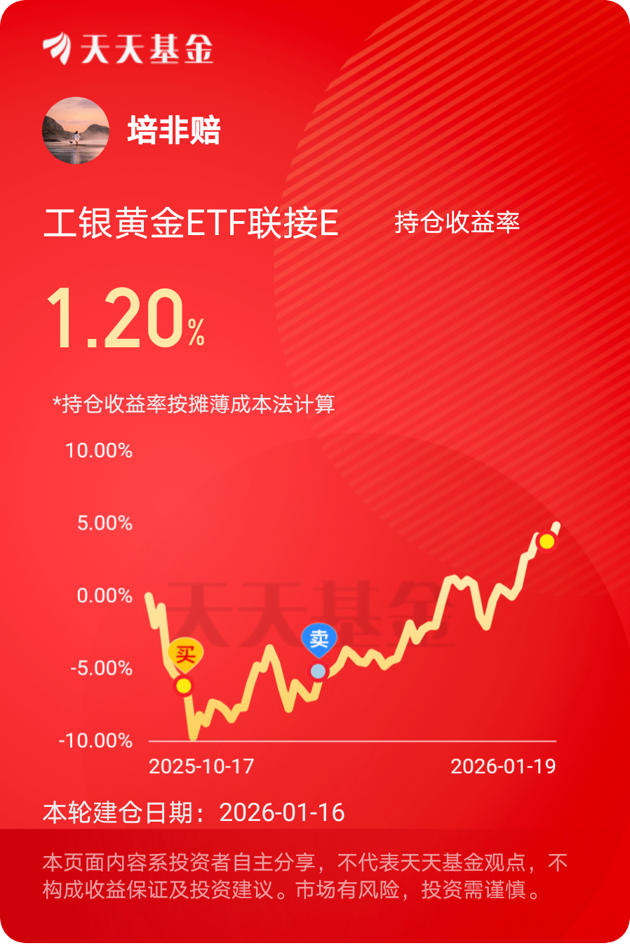 #2026年你怎么看?# 亡羊补牢再买金,工银黄金又买进。事情是这样的:我2025年10月乘黄金回调时,在10月27日申购了$工银黄金ETF联接E$ ,有盈利后恐高于11月25月全部赎回了该基金。此后该基金净值继续上行,十分后悔拍疼大腿。根据新闻信息,经过长时间观察,觉得2026年有色金属特别是黄金仍有较大投资机会,借$工银黄金ETF联接E$投资黄金是最优解。 亡羊补牢,为时未晚,于2026年1月16日黄金价格下跌之时重新申购了$工银黄金ETF联接E$ 。#晒收益#