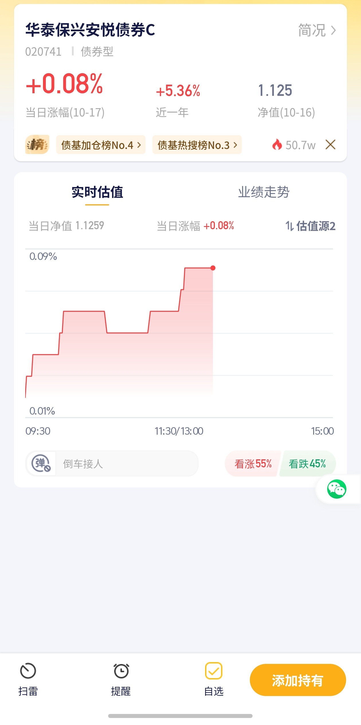 【华泰保兴安悦债券C估值播报+10.17行情】华泰保兴安悦债券C今日估算涨幅+0.08%!收益提前看+当日债市小幅回暖. 今天A股挺磨人的,新能源、半导体带头往下走,创新药也没扛住,也就债券基金稍微稳点,想赚钱得好好挑挑板块了。