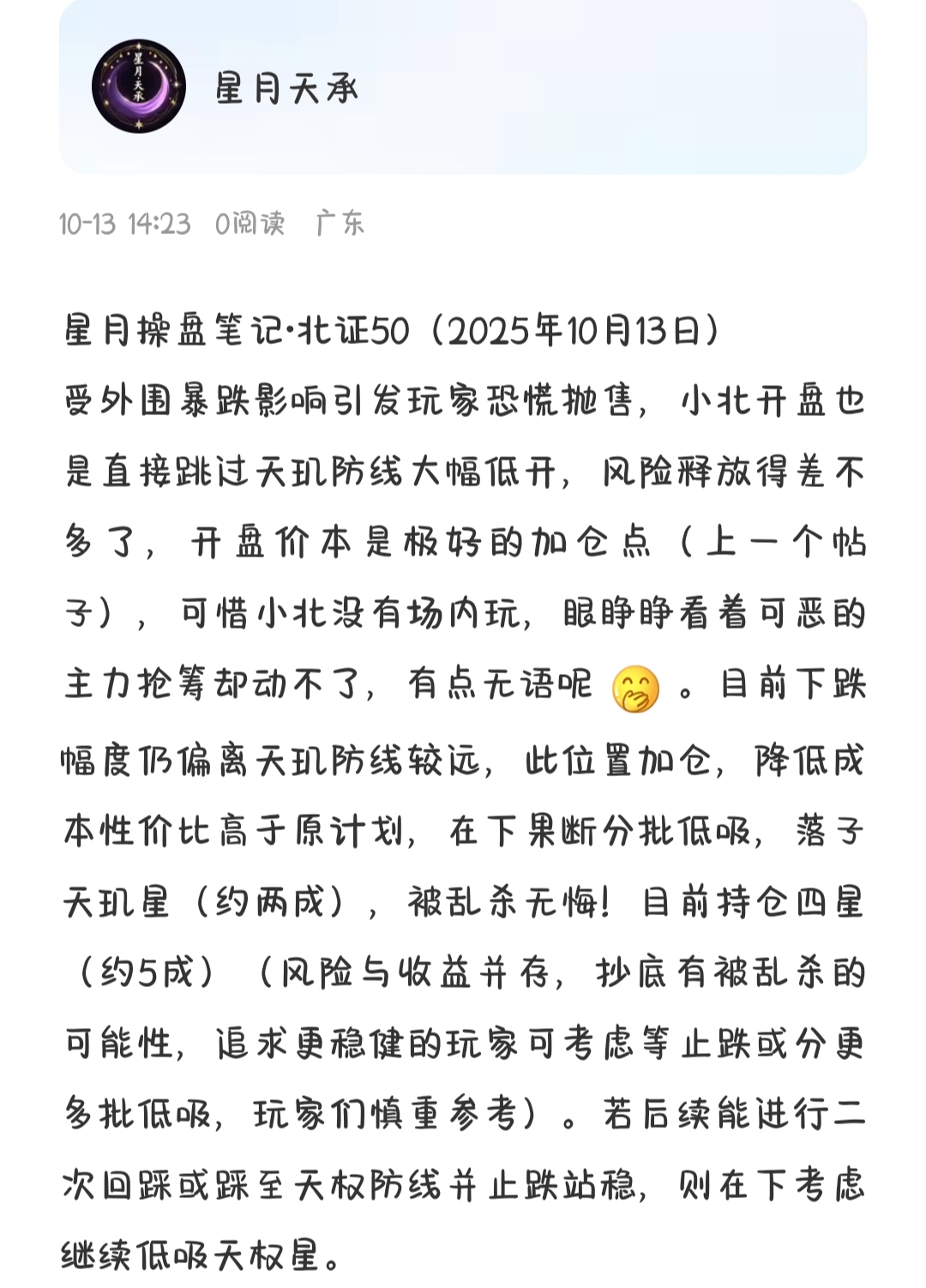 把局势握在手中,这,便是操盘。星月操盘术,10.13日侥幸抄底北证50成功。PS:今天有操作