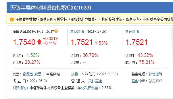 $天弘半导体材料设备指数C(OTCFUND|021533)$牛啊,今天半导体设备继续红,连红4天了,虽然科技板块开始震荡了,但是这只基逆势翻红,而且从长期看,科技方向,特别是半导体设备方向还是持续看好的,业绩也还是很优秀的,近三个上涨36.70%,涨幅还是挺大的,费率也有优势,买入0申购费,满7天卖出0赎回费,非常适合做中长线定投。