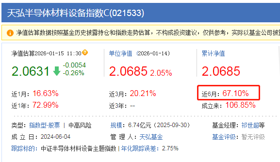 $天弘半导体材料设备指数C(OTCFUND|021533)$半导体设备今天跌幅很小,还是得看主线,业绩是真优秀啊,近3个月上涨20.21%,近6个月上涨67.10%,很不错了呢,关键是半导体材料设备是关键环节,近一年涨幅也大过其他同类指数,所以有调整我就看做是加仓机会,费率也非常有优势,买入0申购费,满7天卖出0赎回费
