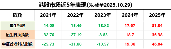 截止到2025年10月29日,港股市场主要指数近5年业绩变动如下:对于都以港股科技公司为主的指数而言,中证香港科技指数业绩相对好一些
