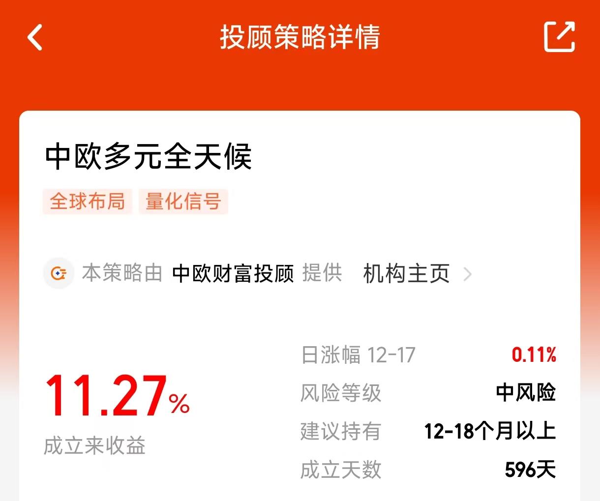 市场风格切换时,也是检验投资策略的好时机。像中欧多元全天候这样的组合,近一周仅波动0.13%,在震荡市中表现出了韧性。在估值高企的市场环境下,防守同样重要。全天候策略不追求短期爆发力,而是通过在全球范围内配置股票、债券、商品等各类资产,力求实现长期的稳健增长,目前额度充足。在天天基金平台,可以通过“投顾管家”页面的“三笔钱投顾”板块找到它。数据显示,中欧多元全天候近一年涨幅8.29%,最大回撤2.02%,波动率2.83%,这样的风险收益特征对于追求资产平稳增长的人来说很有吸引力。#挖掘超额收益#