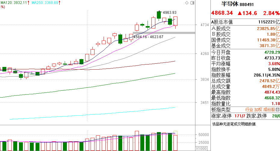 半导体昨天冲高回落小阴调整击穿5天线,把上周五探底回升的小阳线反包,但并没有击穿1月21号的中阳线,我认为只是多空分歧的表现,接下来怎么走得看资金的态度。今天半导体本是低开在10天线,随后向下回探后突然回升,又把昨天的阴线反包,如果从昨天的视觉看,盘面是偏空的,如果以今天的视觉看,盘面又是偏多的。如果看得这么短,我觉得会被主力绕晕,应该以更大周期来观察。