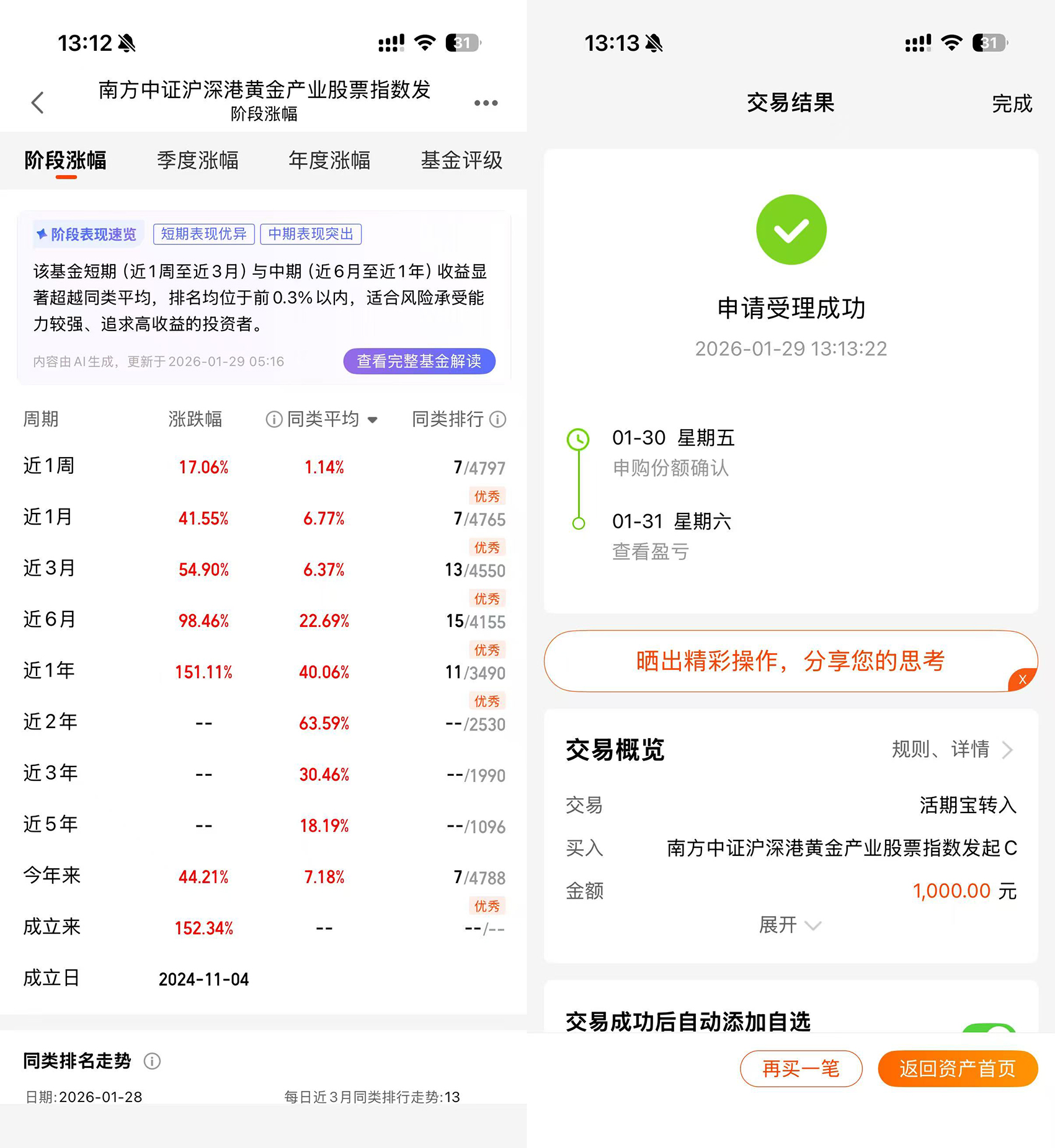 不多说了,今天就赶紧买点跟踪该指数的南方中证沪深港黄金产业股票指数C(021959)$南方中证沪深港黄金产业股票指数发起C(OTCFUND|021959)$,先避免又踏空吧,后续根据走势再择机加仓!
