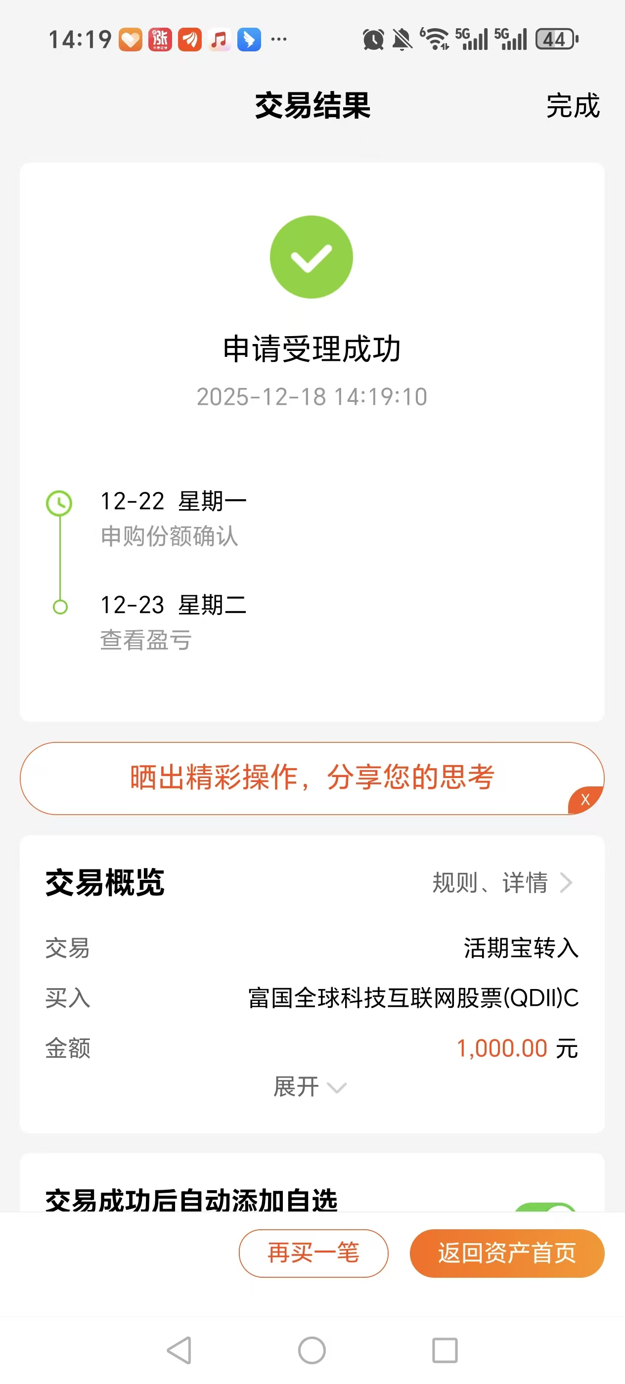 近期美股走势相对一般,毕竟降息落地后,不少提前埋伏的资金开始获利了结,并且 通胀改善节奏、未来政策路径以及地缘政治风险叠加,使得市场对美国中期经济与盈利前景的判断趋于保守,风险溢价有所抬升。所以短期出现了一定的震荡。 不过雨哥认为美股科技一直处于一个慢牛行情中,所以回踩下来反而是机会大于风险,从调整的时间和空间来看,基本上也算是比较到位了。 所以近期雨哥也是通过这只$富国全球科技互联网股票(QDII)C$ 来做布局,从业绩走势来看,该基金近一年涨幅是高达37%,大幅的跑赢同期的纳指,赚钱效应和超额收益还是很明显的。 并且该基金还有个优势就是额度足,不限购,能适合各种大小的资金来做介入。 叠加美联储也继续是一个降息周期,后续还会继续有多次降息,所以雨哥认为全球科技方向接下来有望迎来爆发,今天来对其做一个买入操作。