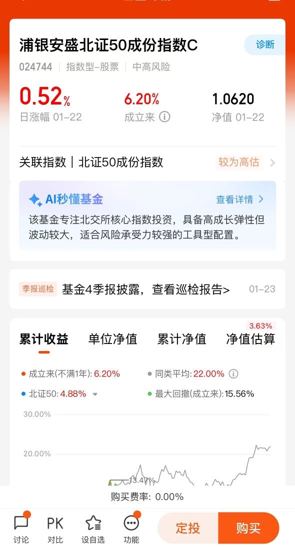 浦银安盛北证50费率低至0.25%销服,不限购还灵活,太香了$浦银安盛北证50成份指数C$