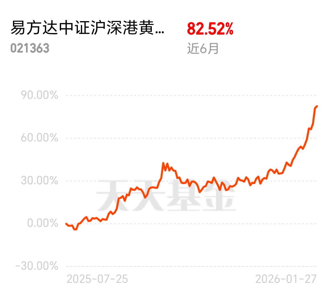 黄金投资选对标的很重要,$易方达中证沪深港黄金产业股票指数发起式C$ 近 6 月 82.52% 涨幅超亮眼,主攻金银 + 有色,黄金股这边不限购,黄金股本就比黄金有更大弹性,易方达这只表现更突出