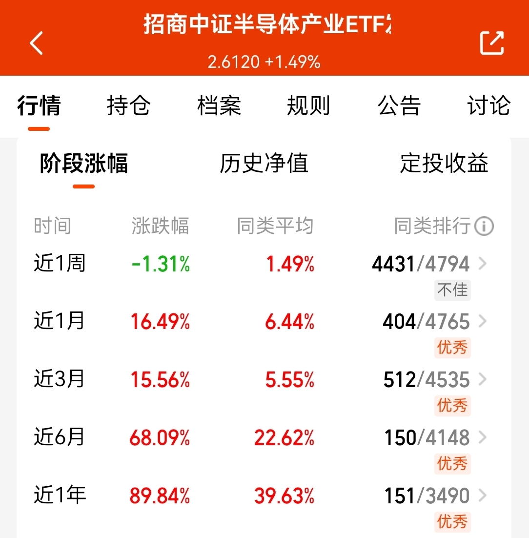 我还是更看好这支$招商中证半导体产业ETF发起式联接C$ ,跟踪半导体龙头,近半年收益68.09%,近一年已经涨了89.84%,业绩稳定性比较高,我觉得这波赚钱效应也更明显啦,这轮半导体行情值得期待!