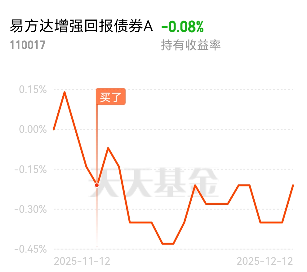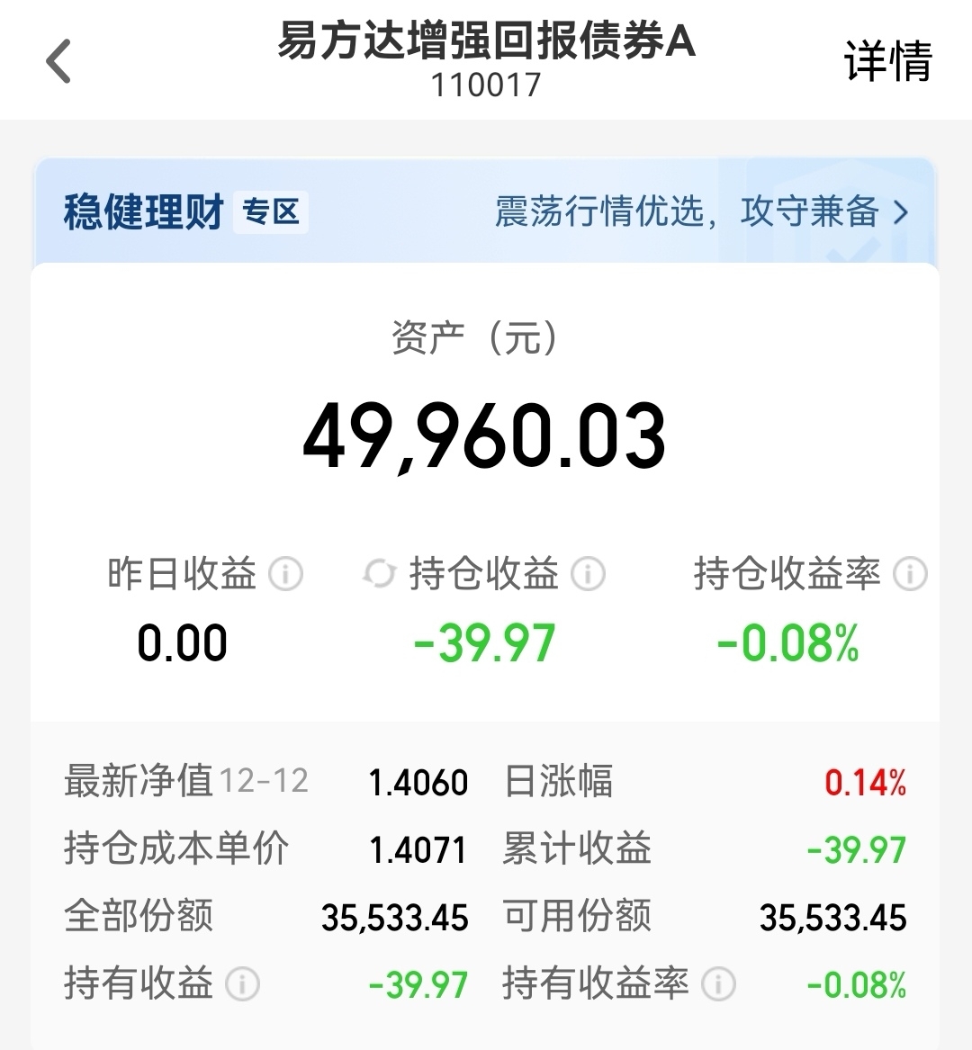$易方达增强回报债券A$ 今天预估收5个,主要是布局的股基方向紫金矿业、中钨高新和电力长江电力都是红的;另外今天消费的伊利、海尔也都涨起来了,都是低估值蓝筹股,最近消费政策不断,年底前应该还会持续发力,可以多关注红利方向的机会。目前个人持仓5W,收益-0.08%,年前是暂且拿稳不动了;