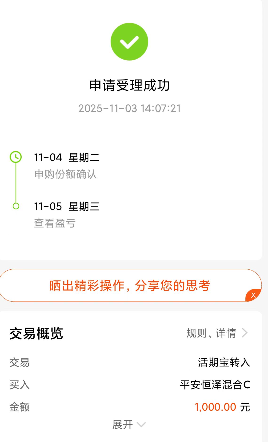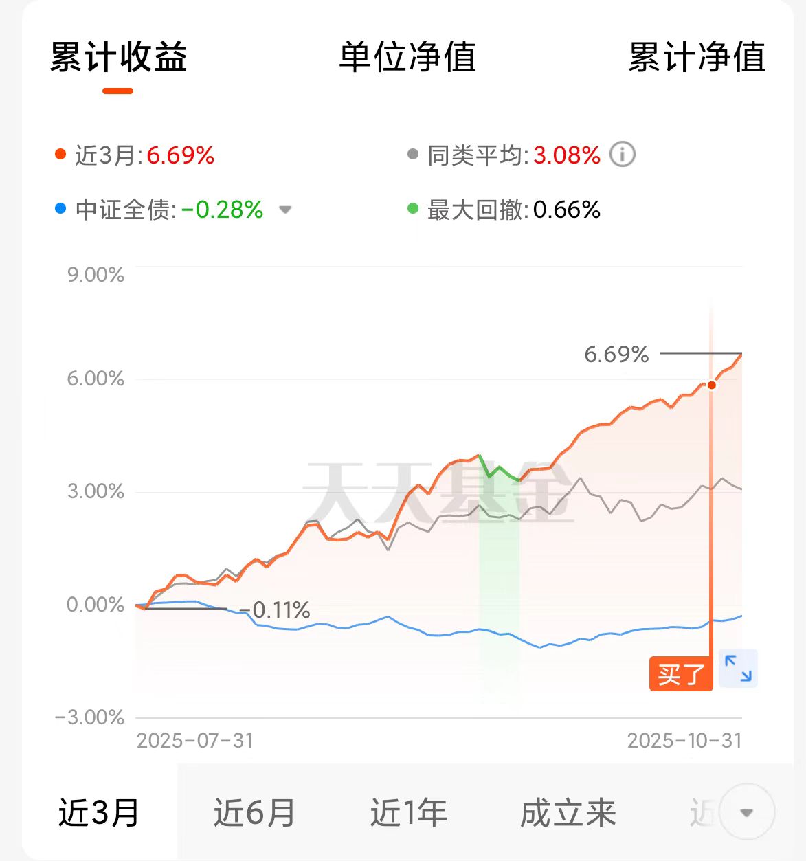 姚姚今天继续加仓1000元的$平安恒泽混合C(OTCFUND|009672)$,因为纯债还有赎回费率的利空悬而不决波动肯定大于恒泽这种一路稳稳爬坡的固收+。咱根据业绩可以看出来恒泽从9月24日开始只出现过三次回撤,而且最大回撤才0.22%,其余时间连续上涨,恐龙蛋也经常出现,近一个月收益2.38%,近三个月收益率6.69%,近一年收益率10.99%,不论长期还是短期都是稳中有进,屡创新高!而且近一周收益率1.05%,说明A公子大幅震荡的期间对它影响不大,反而逆势上涨,咱不想资金在货币基金里面闲置,就在这种又抗跌又稳定的固收+中赚时间价值!
