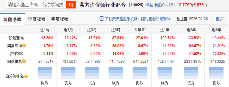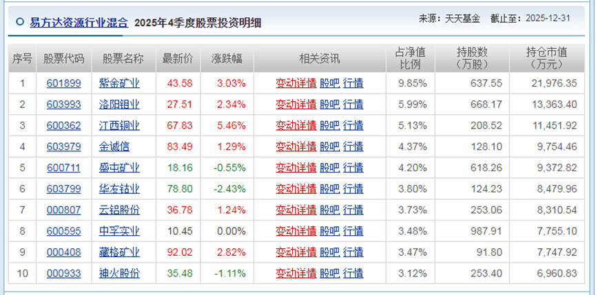 如果我们翻查一下易方达资源行业混合(110025)的过往持仓,会发现,上面6大板块都曾持有过。但是,非常神奇的是,这只基金最新一个季度的前10重仓,全部调成了有色行业,完美的捕捉到了最近有色板块的大级别行情。