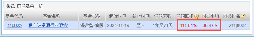 朱运经理,目前只管理这一只基金,任职回报111.01%是同类平均的3倍,同类排名,进行前3%,一个字概括:牛!
