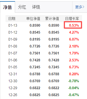 昨天以上各只股票的涨幅,与今天类似,天天基金给出的预计涨幅,高达9%,然而,昨天公布的净值显示是:0.53%;其实,自从2026年1月8日开始,上述重仓股每天都是大涨,这只基金如果没有调仓,仅仅这几天,涨幅绝过能超过30%。