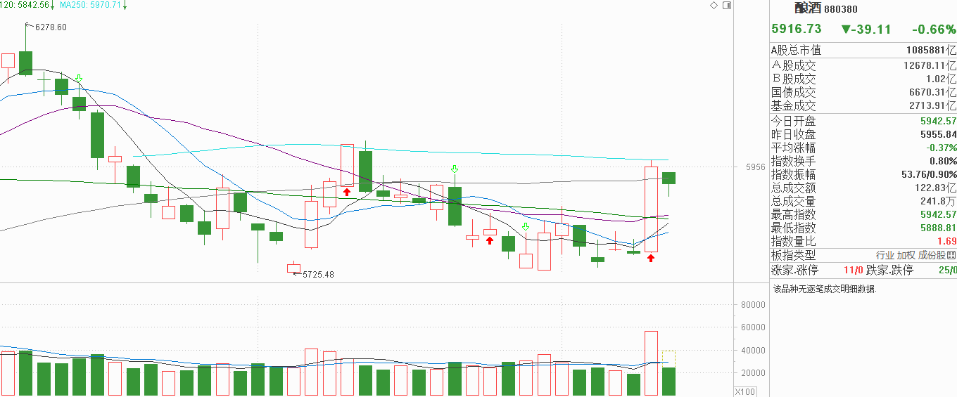 白酒的朋友们,都给我竖起耳朵听好了!昨天大阳反弹力度很大,比10月14-16号的三连阳还要大,一口气突破了20天线、年线、60天线,反弹至半年线后才回落,突然出现这么大的阳线当然是资金流入的信号,白酒前段时间走弱的原因就是资金在9月12号后不断流出,到了箱底后完全没有资金重新流入,一直弱势震荡。不过有一点,强市多长阴,弱市多长阳,要确认昨天资金流入的性质,今明两天必须继续表现强势,甚至出现第二根持续有力度的阳线反弹。今天白酒低开低走重新击穿60天线,感觉市场抛压还是比较大的,就像10月16号白酒回到半年线后又是一波下行,我认为只要今天白酒无法出现中阳反弹,一日游的概率会更大一些。其实现在白酒已经没有多少关注了,资金持续流出筹码抛压也不多,只要有少量资金愿意流向白酒,今明两天再突破半年线也不难。这样吧,我会以60天线和半年线做白酒强弱震荡的分水岭,站上就看好,失守就看淡,跟着主力走,不提前预判。观望。简单说,就跟着主力走,不瞎操练,更不提前预判。市场里头,生存才是硬道理!