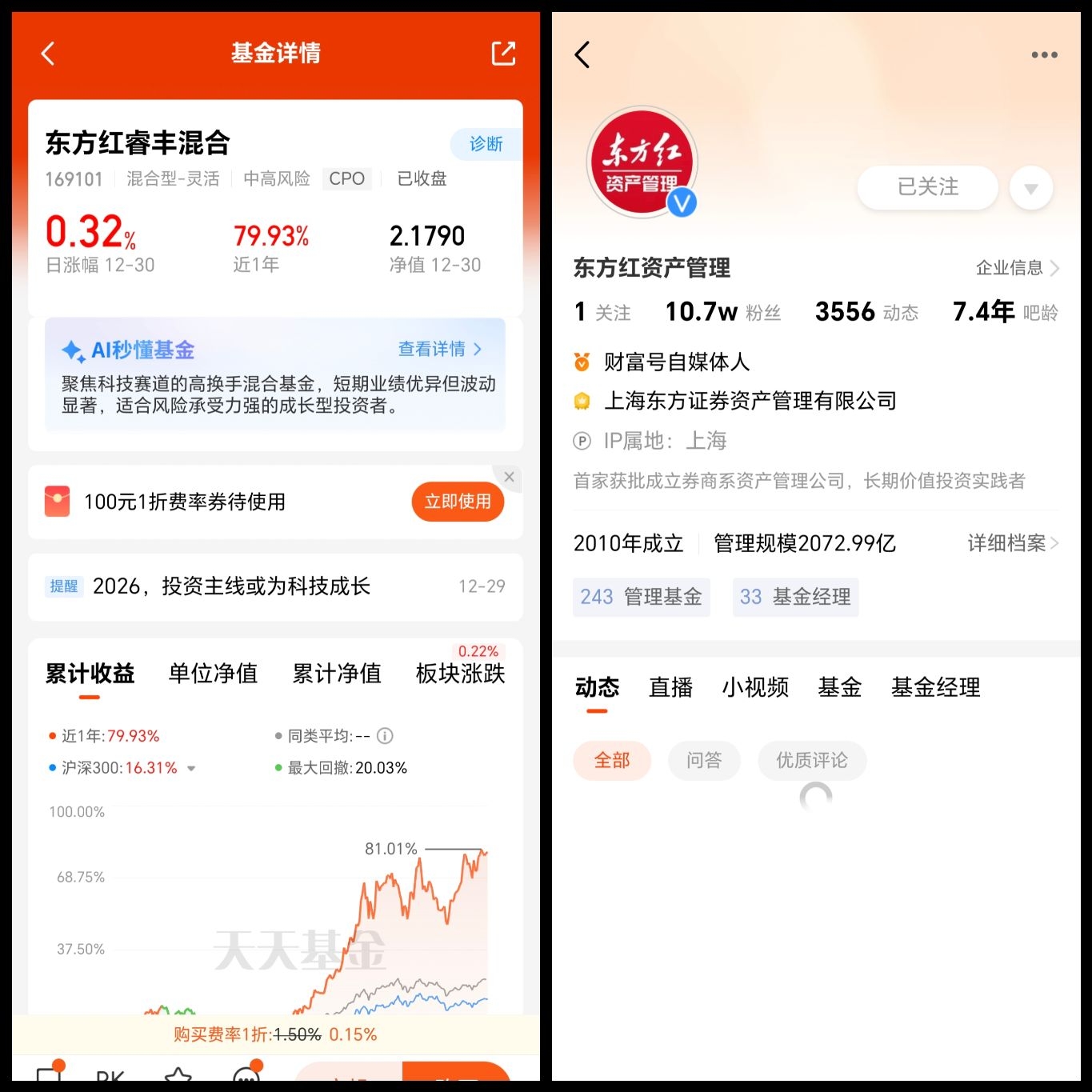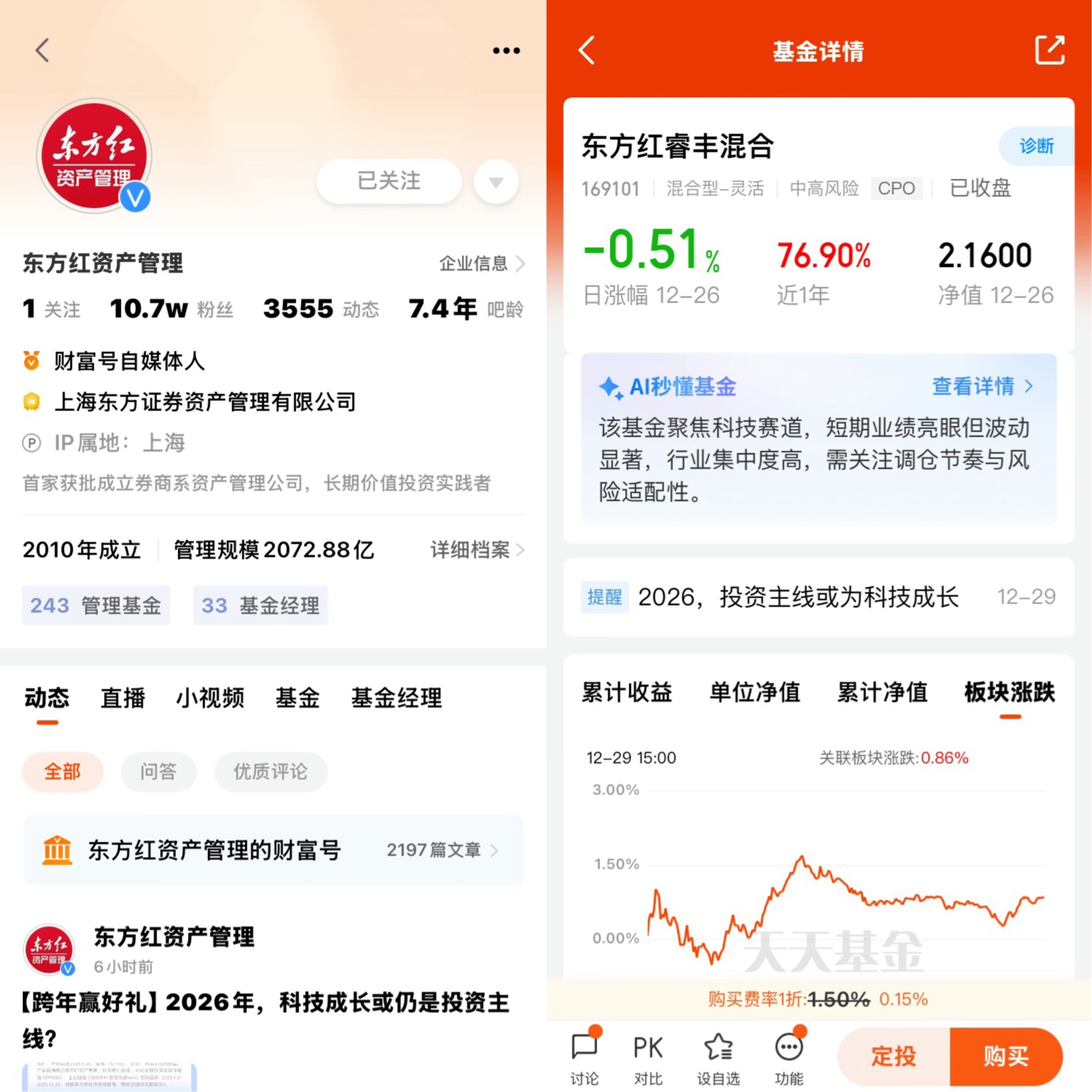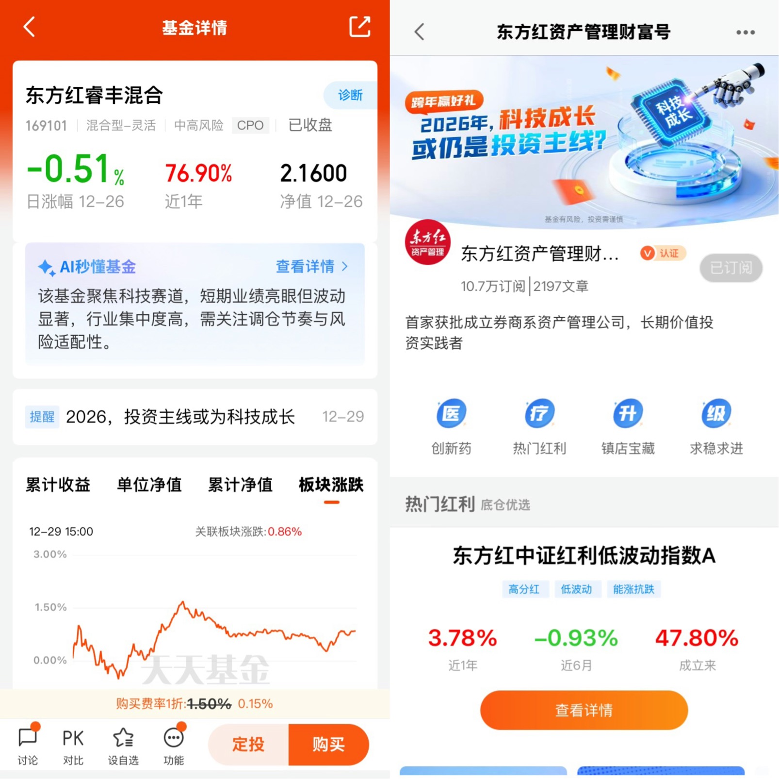 我非常信赖东方红基金,目前定投持有$东方红中证红利低波动指数A$$东方红中证优势成长指数发起C$ $东方红益丰纯债债券C$ 等多只基金,获得了非常好的收益回报和持有体验!元旦后开启定投$东方红睿丰混合$ ,这只基金聚焦科技赛道,2025年收益回报81.39%,在2262只同类基金中排名前4%,业绩表现非常优异!我的2026年投资板块布局是:采取红利+成长的哑铃策略,重点布局红利资产和科技成长板块,继续定投$东方红中证红利低波动指数A$ ,坚持定投$东方红中证优势成长指数发起C$ $东方红睿丰混合$ ,争取获得更好的收益回报!@东方红资产管理