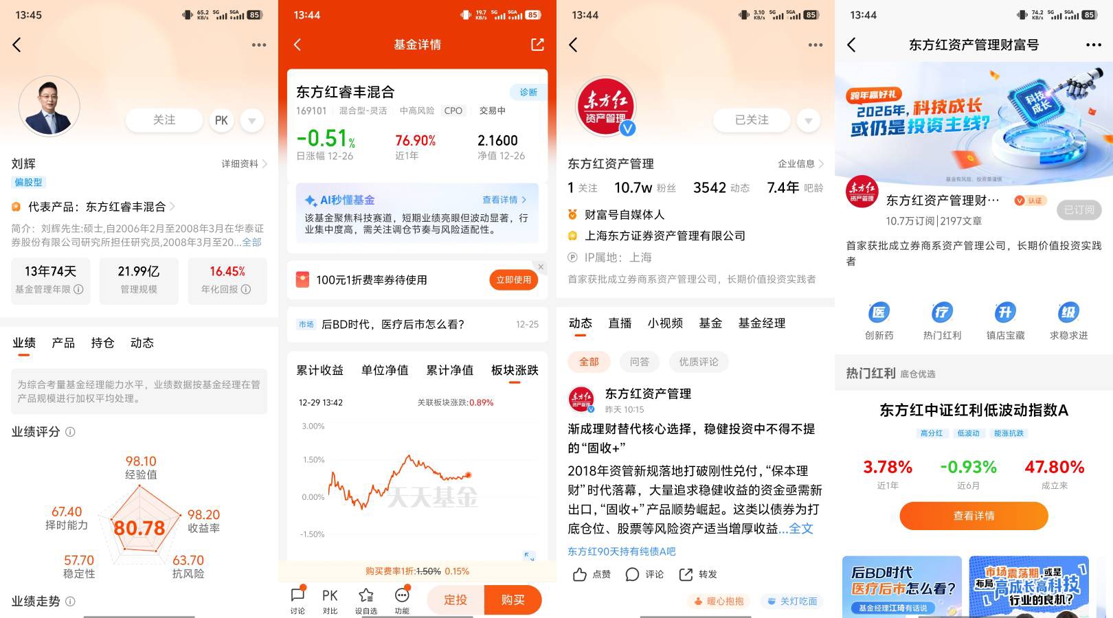 基金公司【东方红资管】核心好:老牌硬核+价值投研天花板 行业鼻祖+合规标杆国内首家券商系资管+首家公募资格券商资管,深耕价值投资27年,历经多轮牛熊,金牛奖拿到手软,风控合规拉满,资金安全兜底性远超中小基金公司。 投研天团+体系碾压近百位专业投研团队,主打「幸运行业+优秀公司+合理估值」价值投资体系,不追热点、不漂移,自上而下选赛道+自下而上挖龙头,选股胜率远高于同类散养式投研,AI/制造赛道研判精准度行业TOP级。 风格稳+长期复利基因坚定长期陪伴优质企业,拒绝短期博弈,旗下产品长期业绩稳定性、风险收益比吊打90%同类,东方红睿丰11年涨332%,正是平台投研实力的极致体现。 基金经理【刘辉...