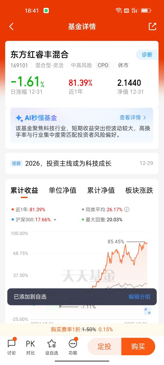 聊起2026年的投资布局,我最笃定的方向还是科技板块。十五五规划重点扶持量子科技、具身智能、6G等领域,叠加全球半导体周期上行、国产替代加速,人工智能、算力、机器人这些科技赛道的长期成长逻辑格外扎实,这也是我一直坚定持有科技类基金的核心原因。而说到实操选择,我持有多年的东方红睿丰混合,就是布局科技板块的靠谱标的,下面我就来实打实的聊聊自己的持有体验!先说说收益体验,这只基金给我的惊喜特别多。近一年净值涨幅超60%,远超同类平均和沪深300,今年三季度单季净值更是暴涨49.55%,我账户里的收益也跟着水涨船高。它精准押中了AI算力、光模块、高端制造这些高景气赛道,新易盛、中际旭创等前十大重仓股都...