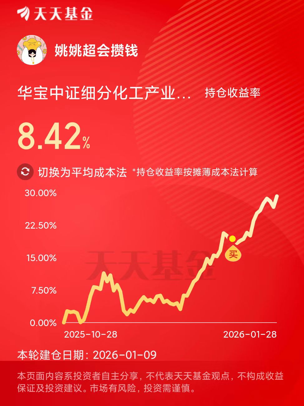 贵金属涨势正酣,化工板块也不甘示弱、火力拉满!姚姚1月9日布局的$华宝中证细分化工产业主题ETF联接C(OTCFUND|012538)$,目前收益已超8%,妥妥吃足波段红利。要知道周期行情里,化工向来是领涨好手,上周市场震荡反复,这只基却拿下五个交易日全红的亮眼表现,短暂回调两日便再度开启大涨模式,走势相当强势!近一周涨2.62%、近一个月涨12.6%、近一年更是大涨超57%,堪称股基里的稳健爬坡实力派。