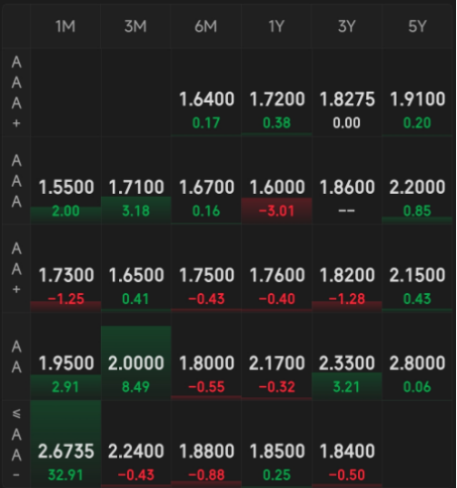债市今天偏弱震荡,午后10年期国债活跃券收益率上行,目前已经上到了1.83。国债期货和利率债大部分下跌,信用债局部相对坚挺。期限利差有所收窄。