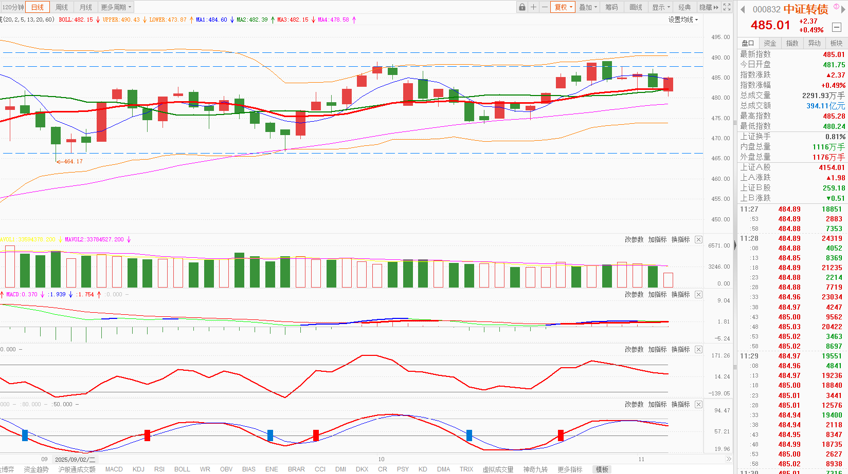 中证转债:涨0.49%,日K线在5日均线之上,KDJ死叉,MACD金叉红柱缩短。今天中证转债上涨,日K线重新站上5日均线,反弹力度较强,是否止跌还有待观察。
