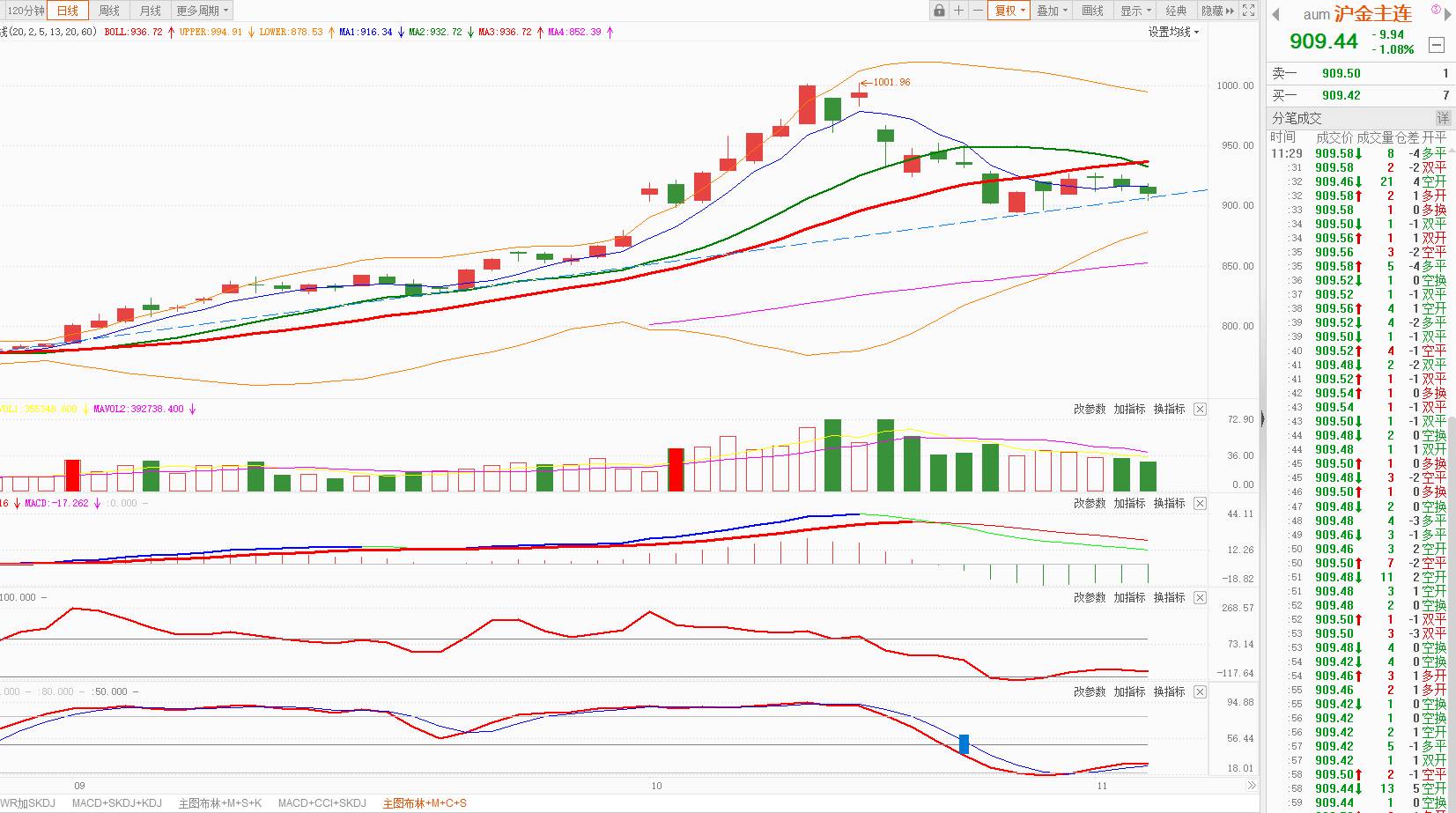 沪金主连:跌1.08%,日K线在5日均线之下。今天沪金下跌,日K线跌破5日均线,探低上升趋势线后小幅回升,目前处于震荡区间下轨附近,目前看有一定支撑,国际金价也探低回升,后市可能继续震荡。仓位较轻的和配置盘可以逢低适量买入。