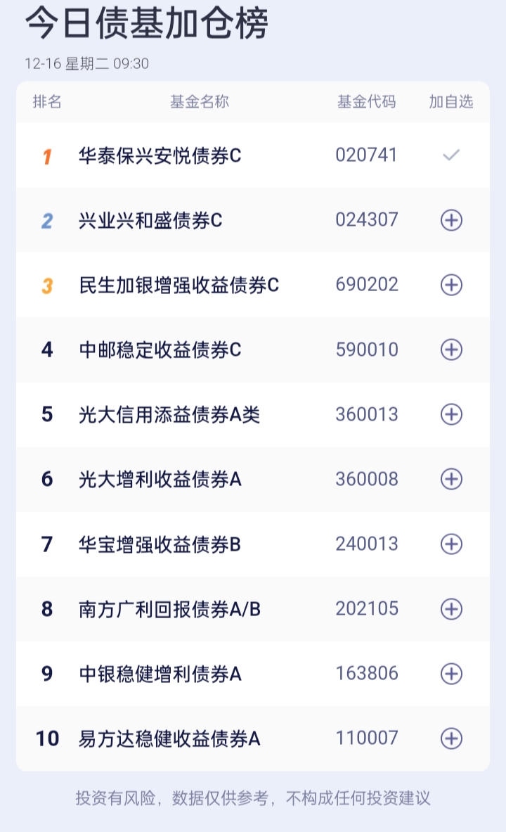$华泰保兴安悦债券C(OTCFUND|020741)$。$永赢稳健增强债券C(OTCFUND|014089)$。$易方达增强回报债券A(OTCFUND|110017)$。$方正富邦鸿远债券C(OTCFUND|015909)$。$东方添益债券(OTCFUND|400030)$。$华泰保兴安悦债券A(OTCFUND|007540)$。$长城短债C(OTCFUND|007195)$。$博时恒乐债券C(OTCFUND|014847)$。$广发中债7-10年国开债指数E(OTCFUND|011062)$。$鹏华丰禄债券(OTCFUND|003547)$