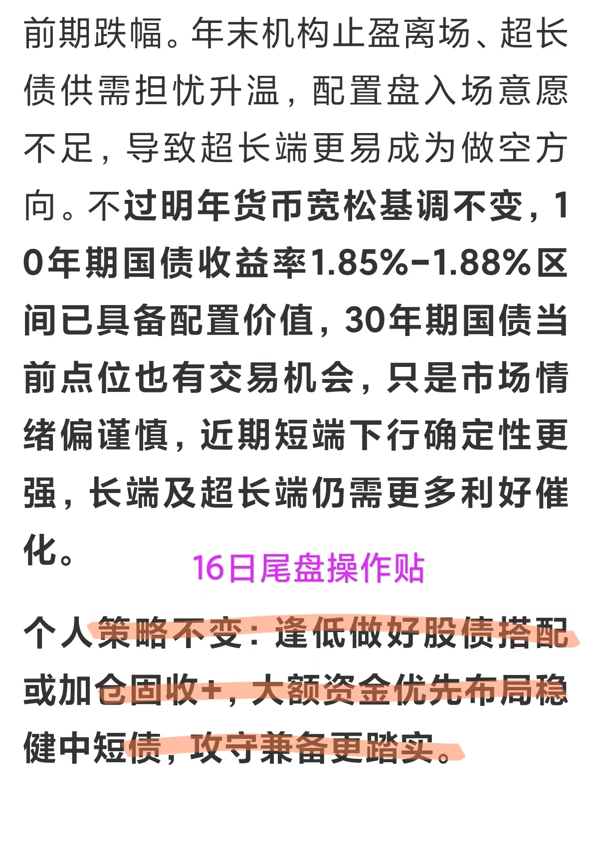资金利率维持低位,若跨年前后也维持这个水平有助于维持非好长端利率,所以债市短期估计还是小碎步修复+震荡走位,超长债虽然看着性价比高,但同时风险也比较高,全看个人风险偏好。