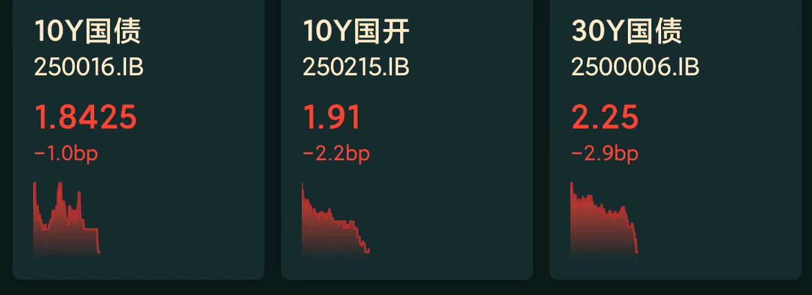 十年期国债收益率:1.8425%,-1BP(国债收益率越跌,债市越涨)