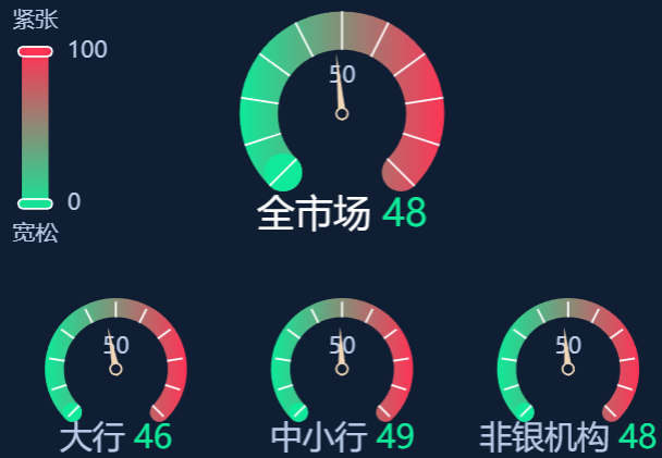 六、资金面情绪指数:全市场48 资金面偏松 (0-100紧张度递增,50为均衡,超过50反映资金紧张)