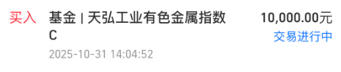 我加仓$天弘中证工业有色金属主题指数发起C(OTCFUND|017193)$10000元!跟踪的工业有色指数这会看大跌3%左右,近期连着上涨后,今天有个回踩正常,不用慌,下方不远处也有20日均线支撑,趁大跌我大额冲上一笔!短期看,美联储降息预期和稀土、铜、铝、铅、锌供需偏紧都利好工业有色上涨,而且受黄金影响也比较小;中长期看稀土成为一种战略性的博弈工具,是我们和对岸谈判的重要筹码!叠加随着AI、消费电子、新能源的发展,工业金属的价值不断提升,所以有调整我就看做是倒车接人机会。$天弘中证工业有色金属主题指数发起A(OTCFUND|017192)$